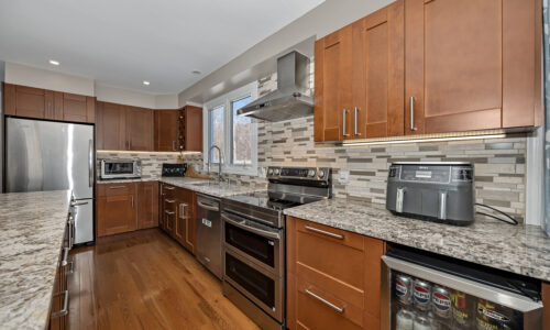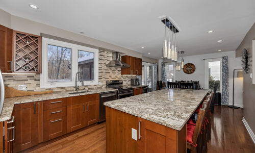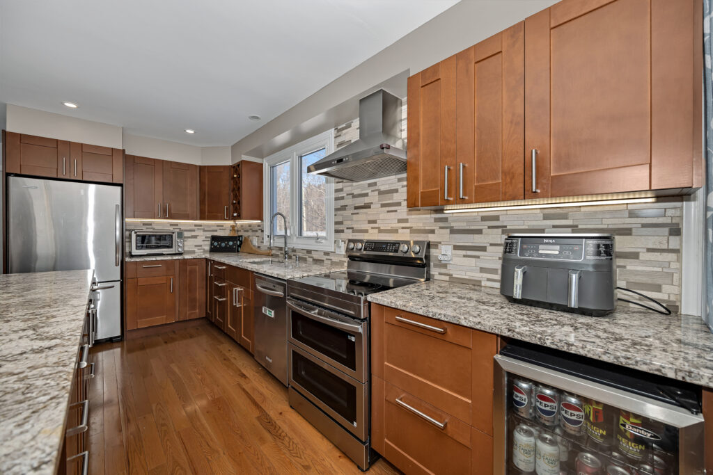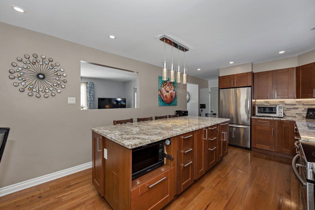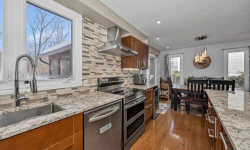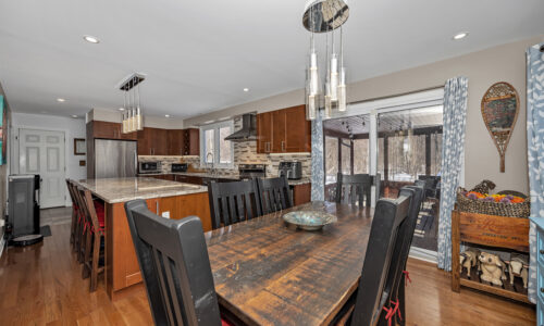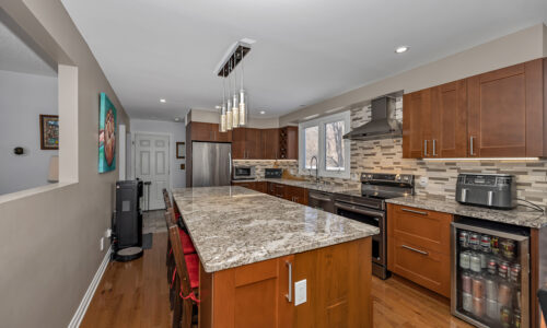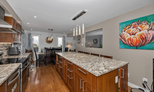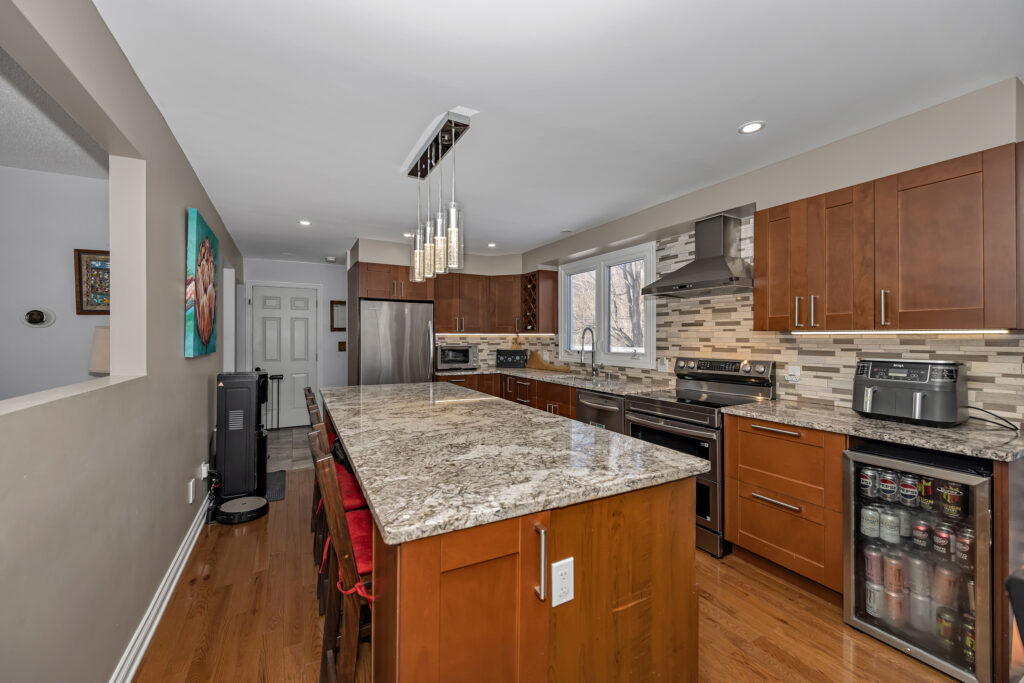 The renovated kitchen is designed for both everyday living and entertaining, complete with stainless steel appliances, pot lights, granite countertops, a farmhouse sink, and an expansive centre island offering generous prep space and storage.