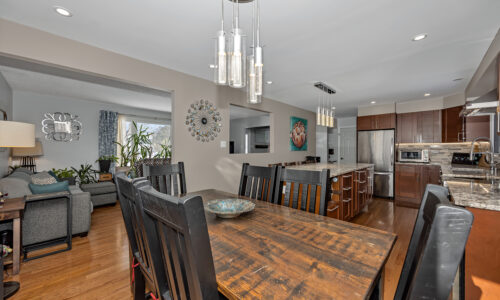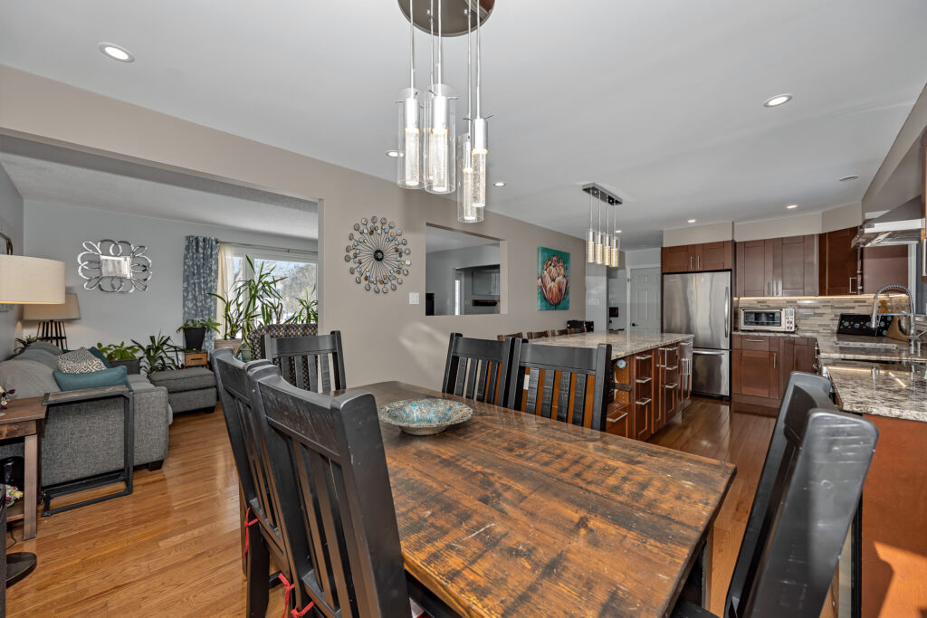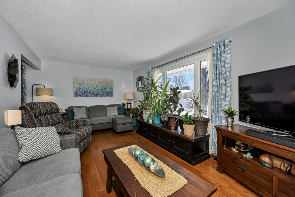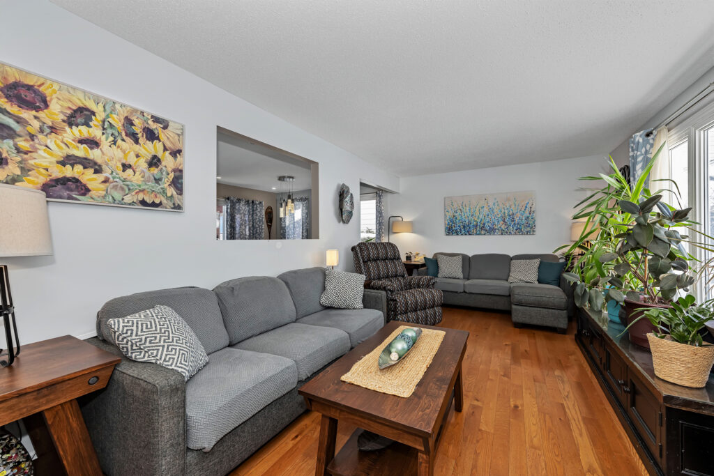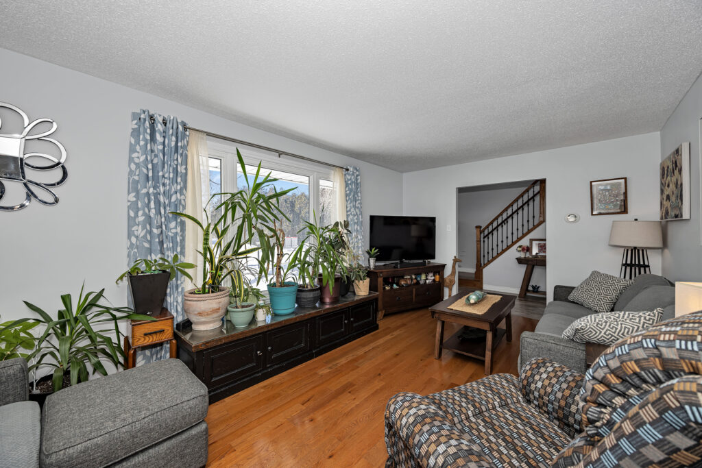 Inside, updated tile flooring runs from the front entry through to the garage access and renovated powder room. Rich hardwood floors flow through the sunlit living room with a large bay window and partial open concept design, extending seamlessly into the dining room and kitchen.