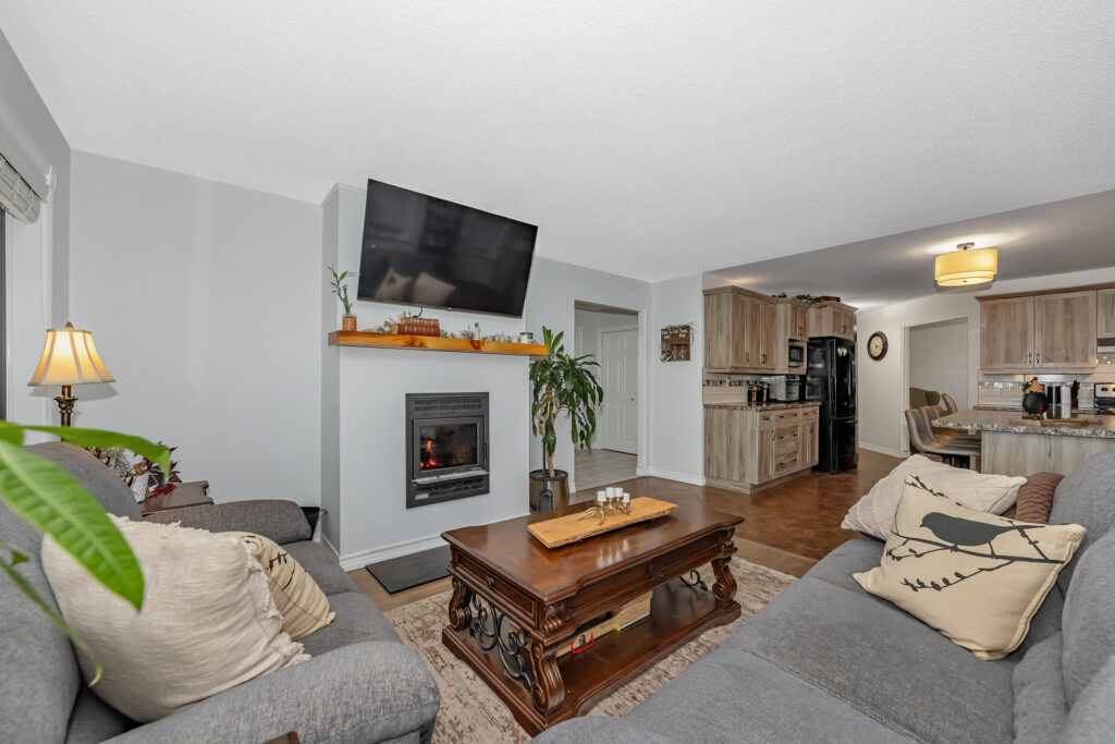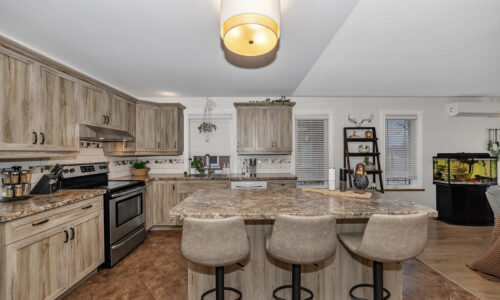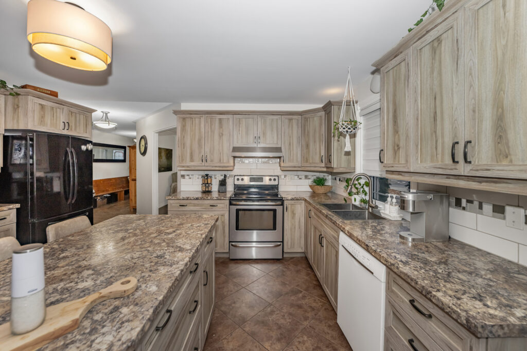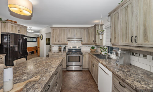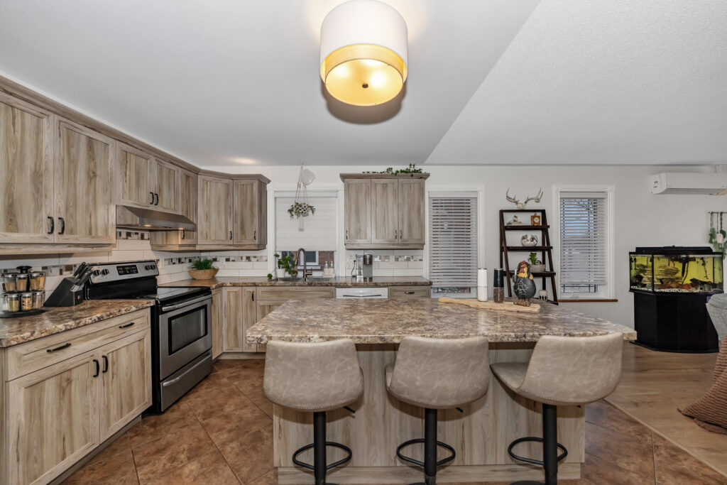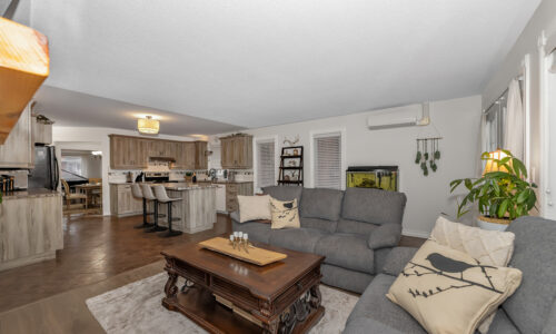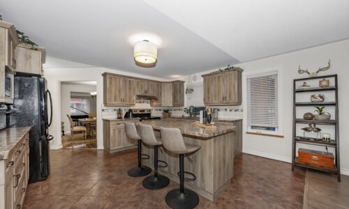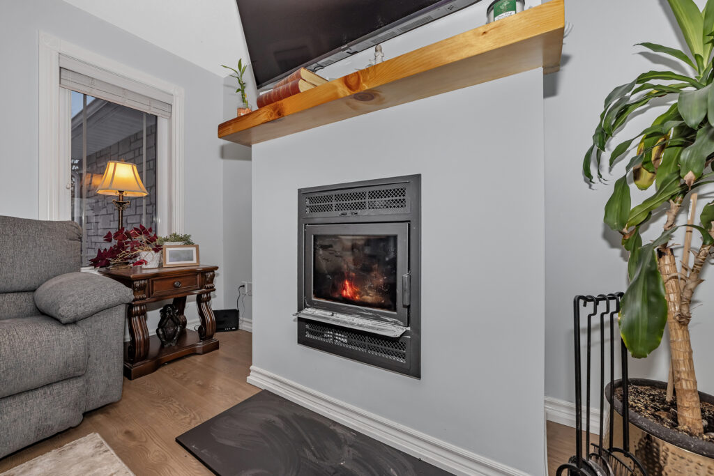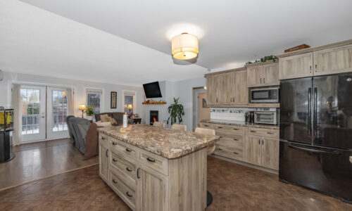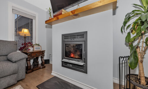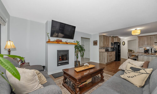 Inside, enjoy one-level living with heated floors throughout and a bright, airy layout filled with natural light. The spacious foyer opens to an expansive kitchen with a large center island, double sink, and abundant cabinet and counter space. The kitchen overlooks the inviting living room, highlighted by a WETT-certified wood-burning fireplace-ideal for cozy family nights.The dining area, located just off the kitchen, flows seamlessly creating a perfect setting for gatherings and entertaining.